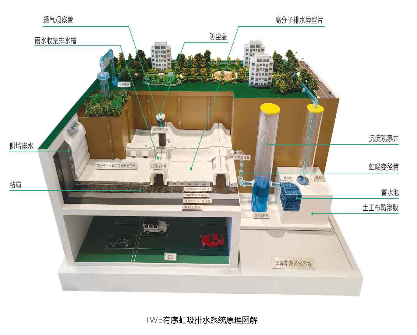 TWE有序虹吸排水系統原理:土壤中的水分通過滲透到達高分子防護排水異型片上方,水分經土工布過濾后流入高分子防護排(蓄)水異型片。水經高分子防護排(蓄)水異型片中的空隙不斷流至相鄰陷虹吸排水槽中。在虹吸排水槽上安裝透氣管,虹吸排水槽內的水在空隙、重力和氣壓作用下能很快匯集到相對應的出水口,出水口通過管道變徑的方式使虹吸直管形成滿流從而形成虹吸,在虹吸作用下,排水槽內的水不斷被吸入沉淀觀察井,流出頂板區(qū)域。流出的水分經觀察井排入雨水收集系統內,待晴天需要對綠化植物進行澆灌時再對雨水進行循王環(huán)利用。