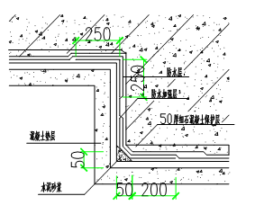 涂膜防水層的施工順序應(yīng)遵循“先遠(yuǎn)后近、先高后低、先局部后大面、先立面后平面”的原則,按照分區(qū)分片后退法進(jìn)行涂刷或噴涂。平面或坡面施工后,在防水層未固化前不宜上人踩踏,固化后應(yīng)按設(shè)計(jì)要求,對涂膜防水層進(jìn)行妥善保護(hù)。 ⑸、結(jié)構(gòu)側(cè)墻防水卷材與結(jié)構(gòu)頂板聚氨酯涂膜及350#紙?zhí)ビ蜌种g須進(jìn)行過渡連接,其做法詳見下圖。
